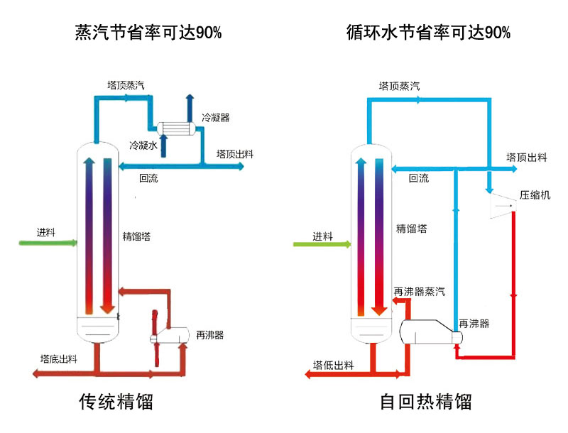 自回热精馏系统(SHRT把塔顶任温蒸汽通过蒸汽压缩机压缩、提高其温度、压力后在再沸器中冷凝将热量传递给塔底物料,仅通过压缩机来维持精馏系统的能量平衡。SHRT系统利用少量电能提高塔顶蒸汽的热品位,高效的回收了塔顶蒸汽的汽化潜热,减少了塔底热量的供应的同时降任了塔顶冷量的消耗,从而达到节能的目的。